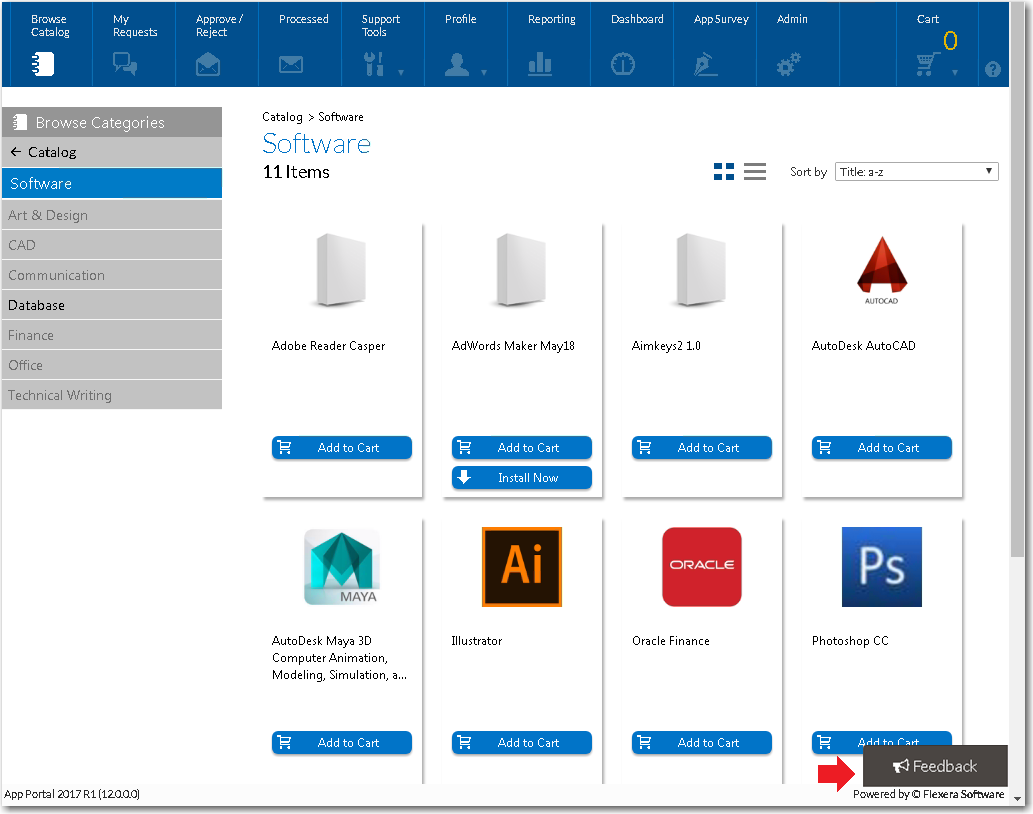 3. Open any non-admin page of App Portal, such as the Browse Catalog tab. The Site Feedback widget is now displayed in the bottom right corner.