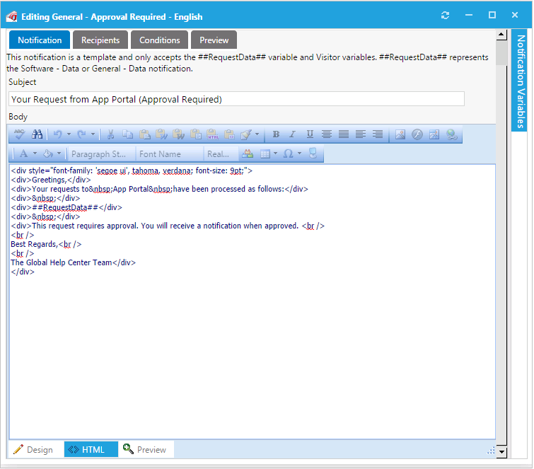 - To insert a variable into the email, click on the Notification Variables button on the right side of the dialog box to open the Notification Variables dialog box, select a variable from the list, and click Add .