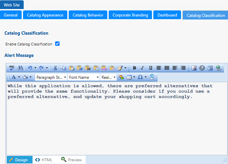 Alert MessageEnter the alert message to be displayed when user selects a non-preferred catalog for checkout. The alert message in the image is added as an example. The alert message is empty out of the box.