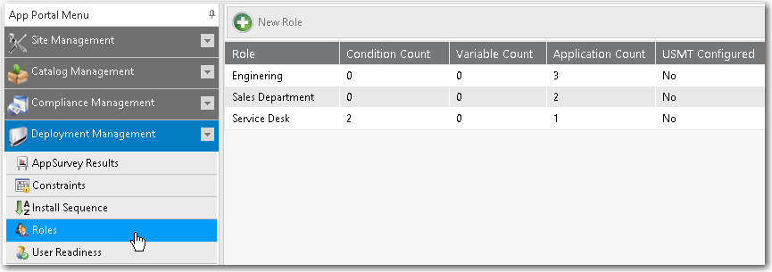 You can use roles to manage software deployments. A role is a logical container that you can use to apply and or group software applications, tasks, settings and/or functions. In a role, you can assign dynamic conditions directly to a catalog item that will enable that role to detect its deployment target.